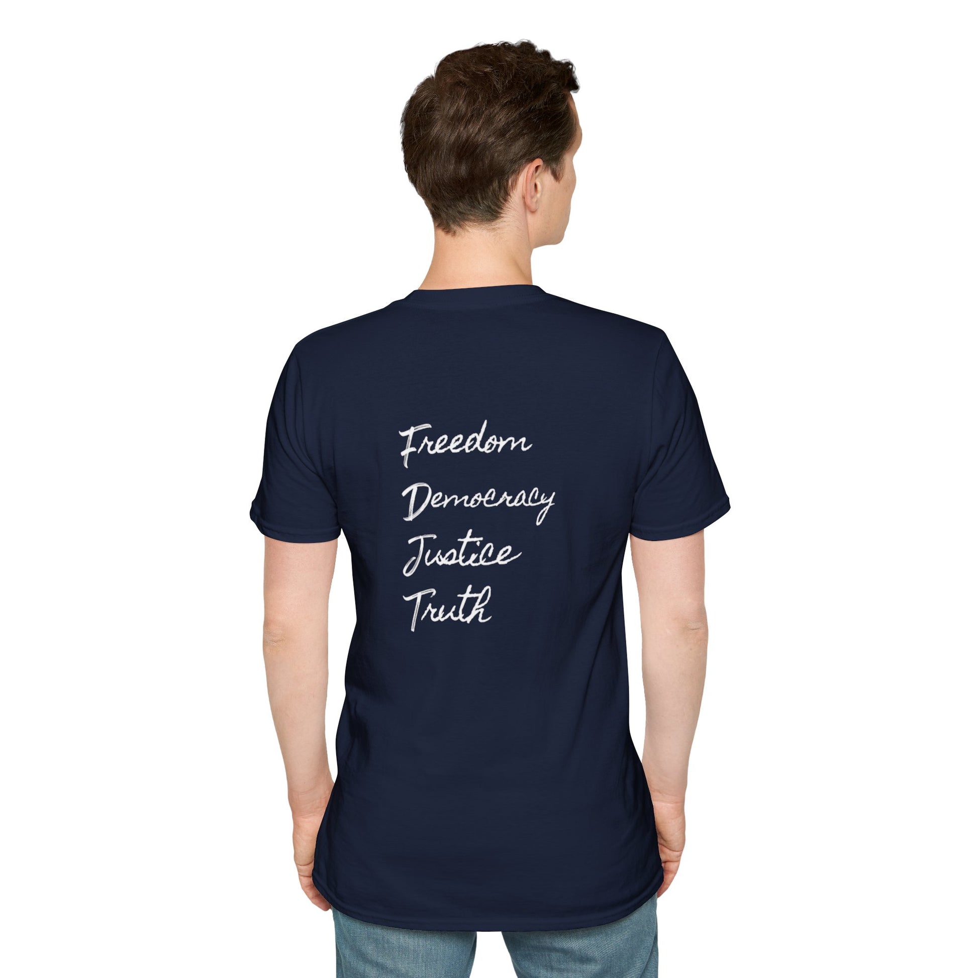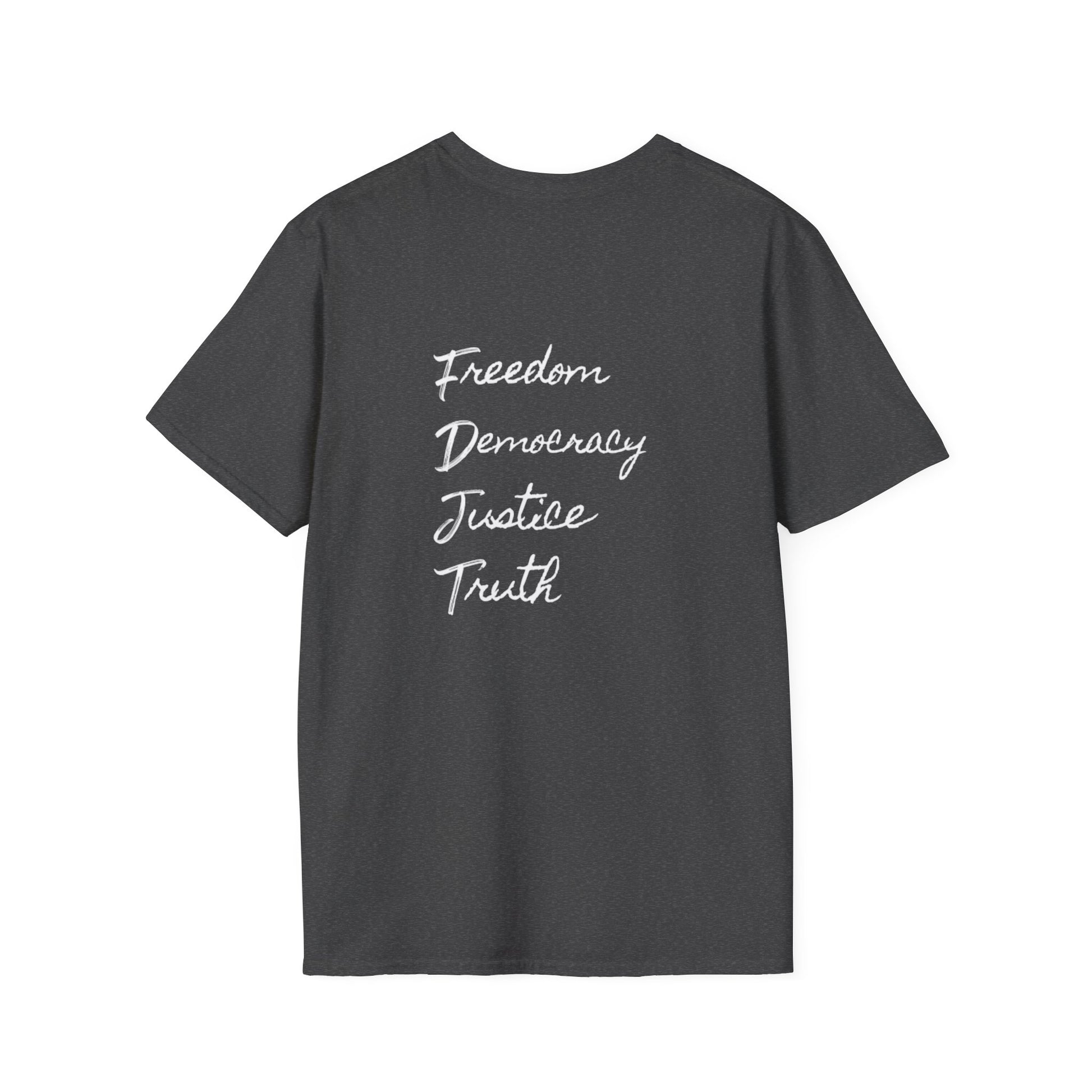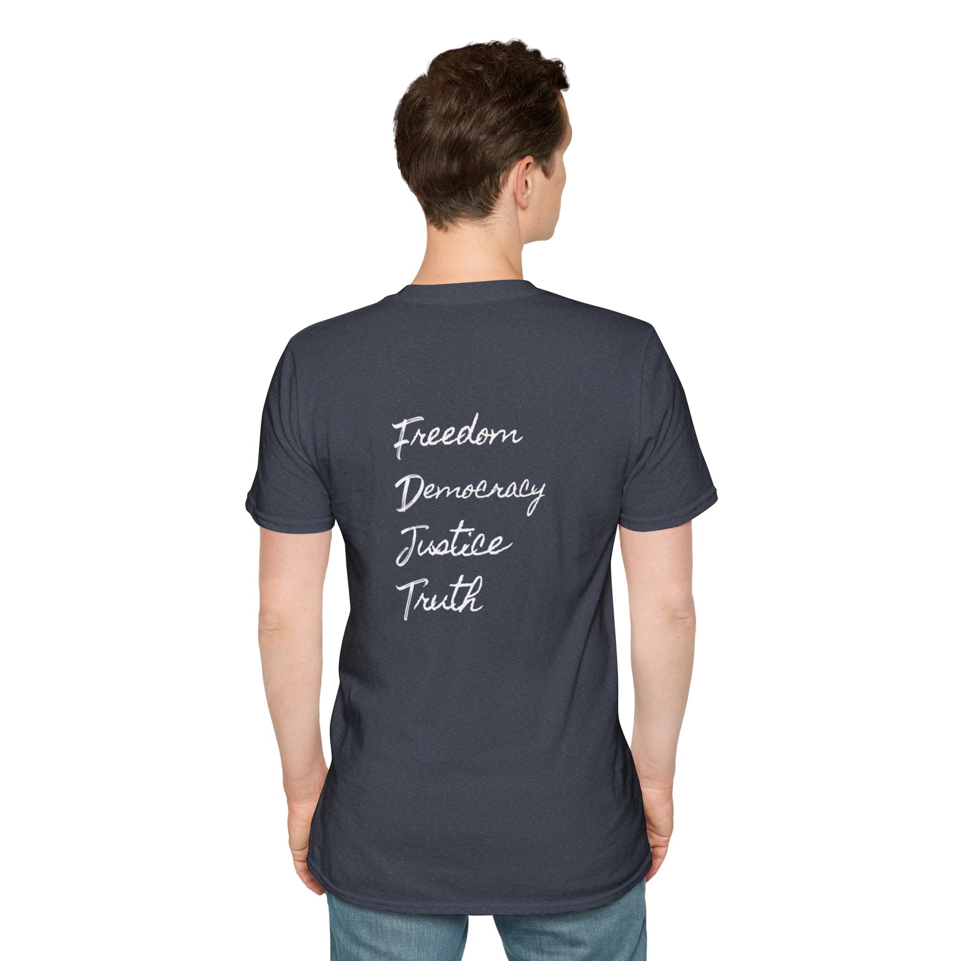 Simple, strong, and impossible to miss. The Freedom & Justice tee keeps the essentials up front - two values worth wearing daily. Soft and versatile, it's ready for everything from meetings to marches. - Softstyle ringspun cotton for an easy, breathable feel - Unisex cut with classic crewneck styling - High‑contrast print for long‑lasting clarity - Designed by Dissenting Design Co. to keep core values visible