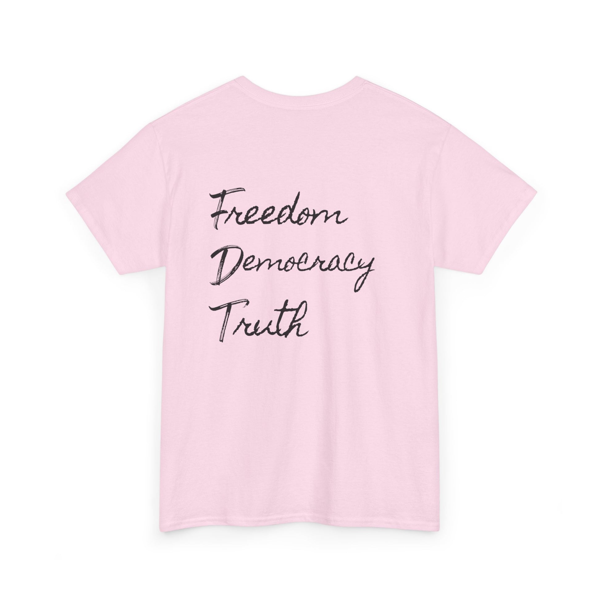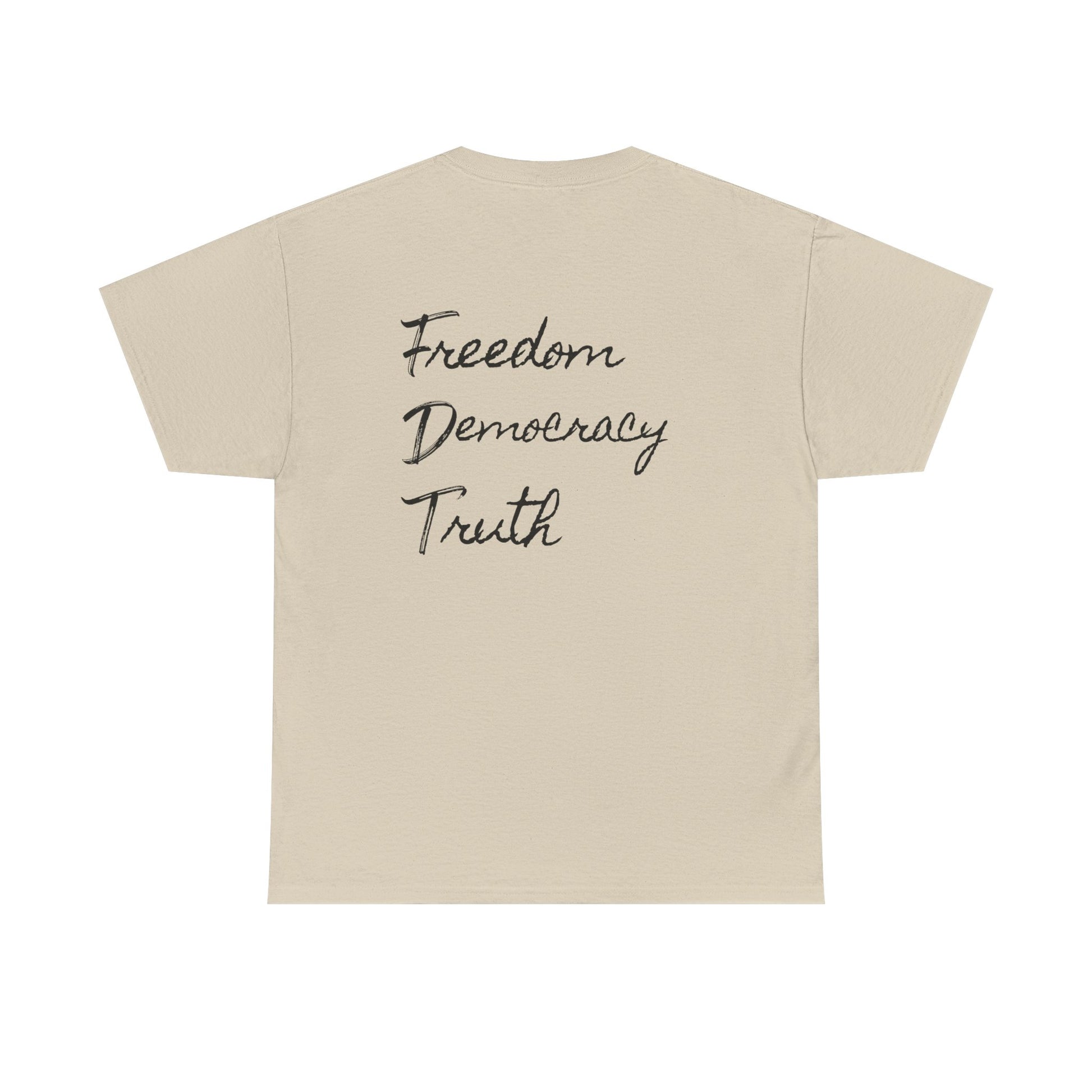 Freedom. Democracy. Truth. This design keeps your values front and center - simple, strong, and impossible to misunderstand. A soft everyday tee for people who still believe words should mean something. - Ringspun cotton for softness and breathability - Unisex fit with classic crew neckline - Crisp print for clean, long‑lasting lines - Designed by Dissenting Design Co. for voters, volunteers, and everyday defenders of democracy.